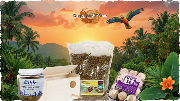 Buitenvogels Verwenpakket Complete set met vogelpindakaas, vogelhuisje, meelwormen en vetbollen, alles voor blije en goed gevoede tuinvogels.